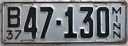 1937 | Embossed black serial on silver plate with border line; vertical "MINN" at right; "37" at bottom left | none | A12-345 | A1 to approximately A40-000 | |