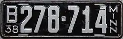 | 1938 | Embossed silver serial on black plate with border line; vertical "MINN" at right; "38" at bottom left | none | A12-345 | A1 to approximately A25-000 | ||