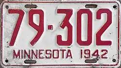 1942–43 | Embossed red serial on cream plate with border line; "MINN - 1942" or "MINNESOTA 1942" centered at bottom | none | 123-456 | 1 to approximately 748-000 | Revalidated for 1943 with black tabs, due to metal conservation for World War II. |