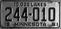 1951 | Embossed black serial on silver plate with border line; "19 MINNESOTA 51" at bottom | "10,000 LAKES" centered at top | 123-456 1-234-567 | 1 to approximately 1-005-000 | |