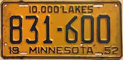 | 1952 | Embossed blue serial on gold plate with border line; "19 MINNESOTA 52" at bottom | "10,000 LAKES" centered at top | 123-456 | 1 to approximately 994-000 | ||