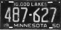 1950 | Embossed white serial on black plate with border line; "19 MINNESOTA 50" at bottom | "10,000 LAKES" centered at top | 123-456 | 1 to approximately 962-000 | First use of the "10,000 Lakes" slogan. |