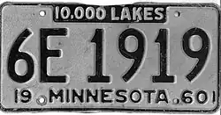 1960–61 | Embossed black serial on reflective white plate with border line; "19 MINNESOTA 60" at bottom | "10,000 LAKES" within embossed black bar centered at top | 1B 1234 | First number corresponds to congressional district of issue | Revalidated for 1961 with blue tabs. |