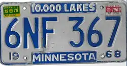 1968–70 | Embossed blue serial on reflective white plate with border line; "MINNESOTA" within embossed blue bar centered at bottom; "19" at bottom left and "68" at bottom right | "10,000 LAKES" within embossed blue bar centered at top | 1BC 123 | First number corresponds to congressional district of issue | Revalidated for 1969 and 1970 with stickers. |