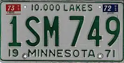 1971–73 | Embossed green serial on reflective white plate with border line; "19 MINNESOTA 71" at bottom | "10,000 LAKES" centered at top | 1BC 123 | First number corresponds to congressional district of issue | Revalidated for 1972 and 1973 with stickers. |