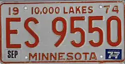 1974–77 | Embossed orange serial on reflective white plate with border line; "MINNESOTA" centered at bottom; "19" at top left and "74" at top right | "10,000 LAKES" centered at top | AB 1234 | AA 1000 to approximately PW 3999 | Some plates manufactured using Illinois' serial dies. Monthly staggered registration introduced 1975. |