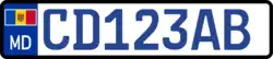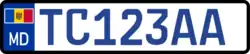 License plates in Moldova were introduced on November 30, 1992. Currently issued plates consist of six black characters on a white background: three letters and three numbers. On the left part of the plates there is a modified, wider than usual blue euroband having the Moldovan flag instead of the EU symbol and the international country code MD underneath it. The plates are 520 mm wide and 112 mm high, made of metal with embossed characters using the FE-Schrift font.[1]