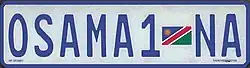 Since 2007, personalised number plates are available at an extra fee. Such plates may carry up to seven alphanumerical characters, followed by the Namibian Flag and the letters NA. They also differ in color and material, the personalised plates are made from acrylic white plastic and have light blue characters.[1]