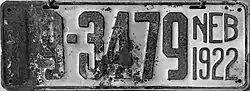 The U.S. state of Nebraska first required its residents to register their motor vehicles in 1905. Registrants provided their own license plates for display until 1915, when the state began to issue plates.[1]