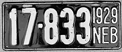 1929 | White on black; "1929 NEB" at right | none | 1-12345 10-1234 |
