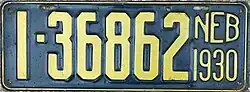 1930 | Yellow on dark blue; "NEB 1930" at right | none | 1-12345 10-1234 |