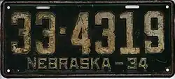 1934 | White on dark green; "NEBRASKA – 34" at bottom | none | 1-12345 10-1234 |