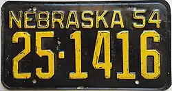 | 1954 | Golden yellow on black; "NEBRASKA 54" at top | none | 1-12345 10-12345 |