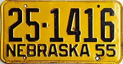 | 1955 | Black on golden yellow; "NEBRASKA 55" at bottom | none | 1-12345 10-12345 |