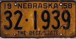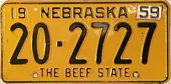 1958–59 | Black on golden yellow with border line; "19 NEBRASKA 58" at top | The Beef State | 1-123456 10-12345 |