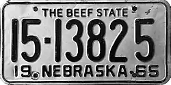 1965 | Black on white with border line; "19 NEBRASKA 65" at bottom | The Beef State | 1-123456 10-12345 |
