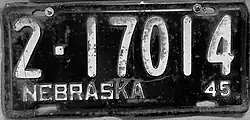 1945 | White on black; "NEBRASKA 45" at bottom | none | 1-12345 10-1234 |
