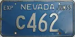 1958–59 | Embossed silver serial on light blue plate with border line; "NEVADA" centered at top; "EXP" at top left and "JUN 59" at top right | A12345 AB1234 |