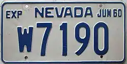 1959–60 | Embossed blue serial on white plate with border line; "NEVADA" centered at top; "EXP" at top left and "JUN 60" at top right | A12345 AB1234 |
