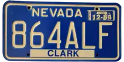 1982–84 | As above, but with "NEVADA" roughly centered at top | 123ABC | 001AAA to approximately 999ANR | Some plates carried the county of issuance on a sticker at the bottom. | |