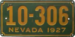 The U.S. state of Nevada first required its residents to register their motor vehicles in 1913. Registrants provided their own license plates for display until 1916, when the state began to issue plates.[1]
