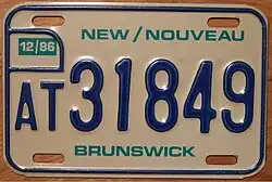 1986 | Embossed blue serial on reflective white plate; border lines around plate and around top corners; "NEW / NOUVEAU" and "BRUNSWICK" screened in turquoise centred at top and bottom respectively | none | AB12345 | issued | notes |