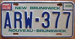1986–89 | Embossed blue serial on reflective white plate; border lines around plate and around top corners; "NEW BRUNSWICK" and "NOUVEAU-BRUNSWICK" screened in turquoise centred at top and bottom respectively | none | ABC-123 | AAA-000 to approximately ARZ-999 | |