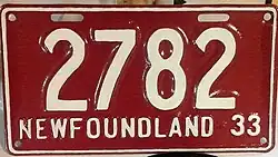 1933 | Embossed white serial on red plate with border line; "NEWFOUNDLAND-33" at bottom | none | 1234 | 1001 to approximately 2800 | |