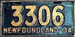 1934 | Embossed orange serial on black plate with border line; "NEWFOUNDLAND-34" at bottom | none | 1234 | 1001 to approximately 3600 | |