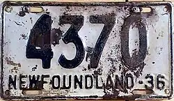 1936 | Embossed blue serial on white plate with border line; "NEWFOUNDLAND-36" at bottom | none | 1234 | 1001 to approximately 4200 | |
