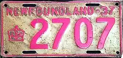 1937 | Embossed red serial on white plate with border line; embossed crown graphic at left; "NEWFOUNDLAND-37" at top | none | 1234 | 1001 to approximately 4800 | |