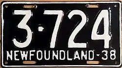 1938 | Embossed white serial on black plate with border line; "NEWFOUNDLAND-38" at bottom | none | 1-234 | 1-001 to approximately 5-100 | |