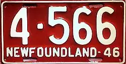 1946 | Embossed white serial on red plate with border line; "NEWFOUNDLAND-46" at bottom | none | 1-234 | 1-001 to approximately 6-400 | |