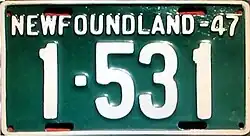 1947 | Embossed white serial on green plate with border line; "NEWFOUNDLAND-47" at top | none | 1-234 | 1-001 to approximately 7-200 | |