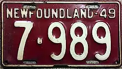 1949 | Embossed white serial on red plate with border line; "NEWFOUNDLAND-49" at top | none | 1-234 | 1-001 to approximately 9-000 | Joined Canada |