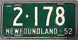 1952 | Embossed white serial on green plate with border line; "NEWFOUNDLAND-52" at bottom | none | 12-345 | 1-001 to approximately 19-000 | |