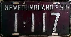 1953 | Embossed white serial on maroon plate with border line; "NEWFOUNDLAND-53" at top | none | 12-345 | 1-001 to approximately 21-000 | |
