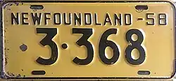 1958 | Embossed black serial on yellow plate with border line; "NEWFOUNDLAND-58" at top | none | 12-345 | 1-001 to approximately 39-000 | |