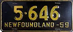 1959 | Embossed yellow serial on black plate with border line; "NEWFOUNDLAND-59" at bottom | none | 12-345 | 1-001 to approximately 43-000 | |