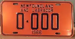 1966 | Embossed dark blue serial on orange plate with border line; "NEWFOUNDLAND AND LABRADOR" and "1966" centred at top and bottom respectively | none | 12-345 | 1-001 to approximately 74-000 | |