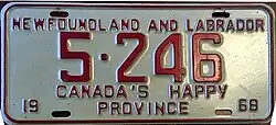 1968 | Embossed red serial on white plate with border line; "NEWFOUNDLAND AND LABRADOR" at top; "19" at bottom left and "68" at bottom right | "CANADA'S HAPPY PROVINCE" centred at bottom | 12-345 | 1-001 to approximately 87-000 | |