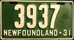 1931 | Embossed white serial on green plate with border line; "NEWFOUNDLAND-31" at bottom | none | 1234 | 1001 to approximately 3600 | |