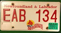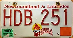 Embossed red serial on white plate; graphic screened at bottom featuring a Viking ship with a red sail against a yellow sunset; "Newfoundland & Labrador" screened in red at top | "A WORLD OF DIFFERENCE" screened in red below and to right of graphic | ABC 123 | ATA 001 to AZF 999 | ||