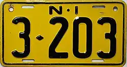 Prior to the 1961 adaption of the current format, hand painted plates were issued. After 1961, NI started to use Australian standard dies plates in black on yellow and the format are all numeric for vehicles and motorbikes in C-123 format. Administrative vehicles are issued in Red A and black on white base in numerics shown as A-123 and motorcycles A C-12.