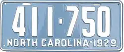 1929 | Embossed white serial on sky blue plate with border line; "NORTH CAROLINA-1929" at bottom | none | 123-456 | 100-001 to approximately 580-000 | First use of the full state name. Horsepower classes same as 1926–28 but no letter used for the 25 hp and under class; for the other classes, the letter was carried at the right of the plate. This happened again in 1930. |