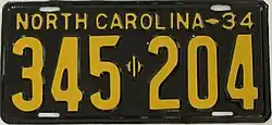 1934 | Embossed yellow serial on black plate; "NORTH CAROLINA–34" at top | none | 123-456 | 100-001 to approximately 493-000 | |