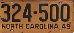 1949 | Embossed black serial on golden yellow plate; "NORTH CAROLINA 49" at bottom | none | 123-456 | 100-001 to 800-000 | From the personal collection of Richard Watson. |