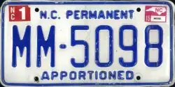 Apportioned Truck | 2006–present | Embossed blue on white with border line; "N.C. PERMANENT" at top; "APPORTIONED" at bottom | LB-1234 MB-1234 NB-1234 |