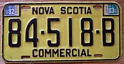 Commercial | 1978–2012 | Embossed black serial on yellow plate; border lines around plate and around top corners; "NOVA SCOTIA" and "COMMERCIAL" centred at top and bottom respectively | 12-345-A | 10-000-A to 37-519-D | Currently issued to commercial vehicles above 5,000 kg (11,000 lb). Passenger plates issued to lighter commercial vehicles since 1986.[4] |