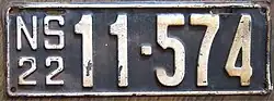 1922 | Embossed white serial on black plate with border line; "NS 22" at left | 12-345 | 1-001 to approximately 15-500 | |